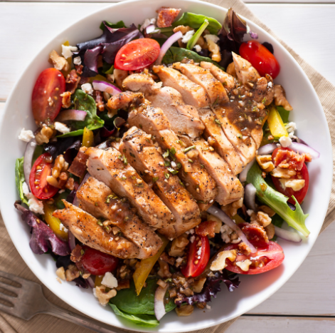 This delicious Greek salad topped with marinated chicken breast is the best for an easy, quick and delicious light supper or prepped ahead for weekday lunches!
